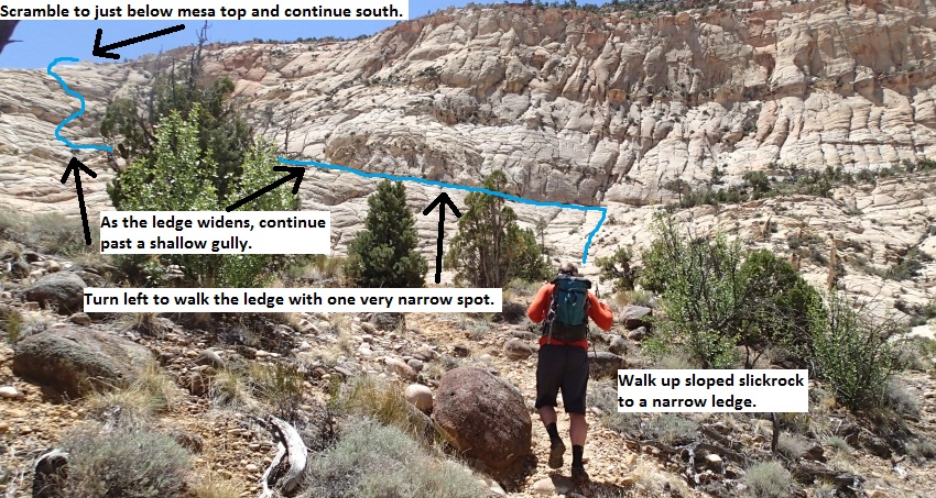 Upper end of the slickrock drainage ends as it meets a steep slickrock wall. Turn left and walk east along a narrow ledge for about 300 feet to where it widens out. About half way across the ledge is a small section where the ledge is narrow and care should be taken not to slip.